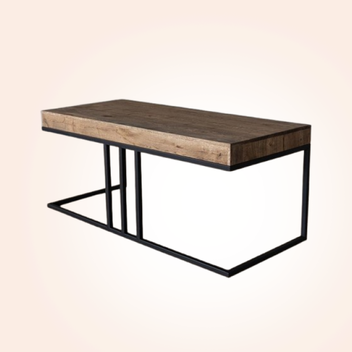 The Center Table – 005 by Bluefox Furniture showcases a modern industrial design with a bold metal frame and a rich wooden-finish tabletop. This sleek and stylish table blends rustic charm with contemporary aesthetics, making it an ideal centerpiece for today’s modern interiors. Its unique side-supported base provides visual interest while maintaining strength and stability.