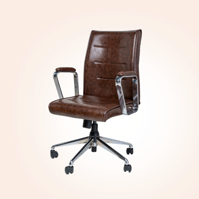 The Mid Back Chair – 002 comes with a rich brown leatherette finish and a clean, modern design. Its mid-height back provides balanced support, while chrome armrests and a sturdy base enhance durability and style.
