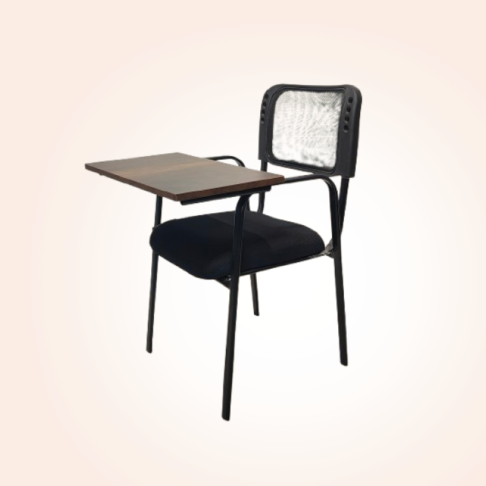 The Writing Pad Chair – 001 features a comfortable cushioned seat with an attached writing pad for convenient note-taking. Its sturdy metal frame and compact design make it ideal for academic and training environments.