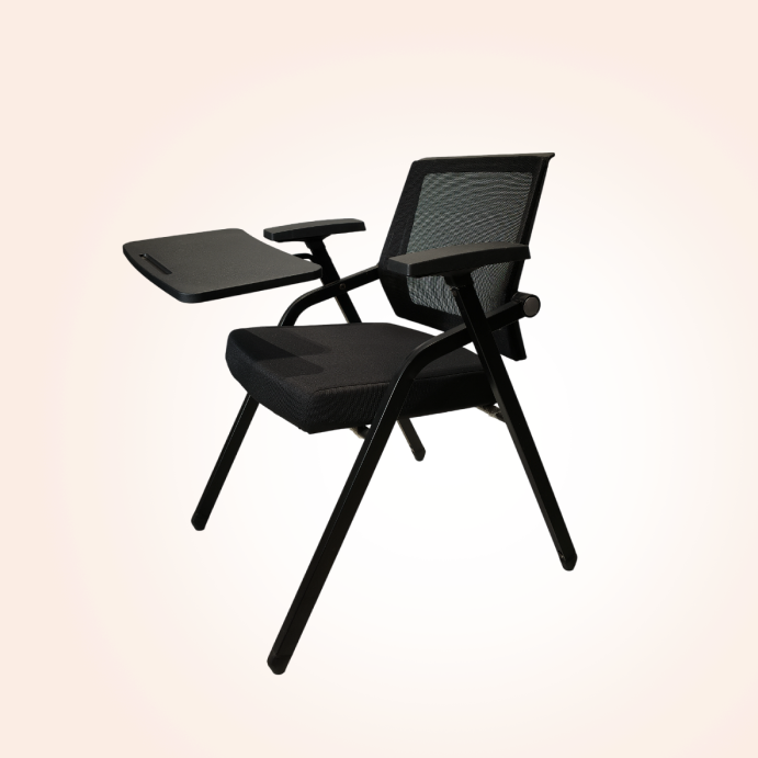 Writing Pad Chair – 005 by Bluefox Furniture features a modern black metal frame with a comfortable cushioned seat and breathable mesh backrest. The attached writing pad offers a practical solution for focused learning and training environments.